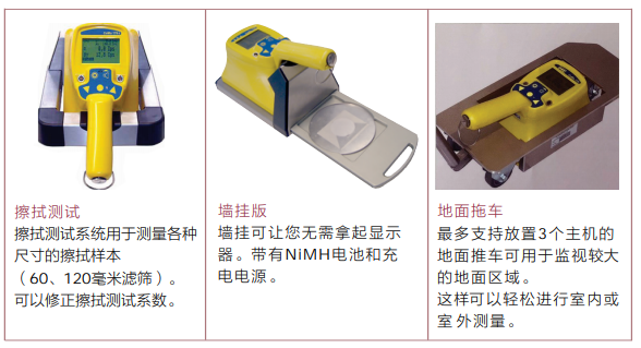 串行接口 RS 232(PC,打印機) 增強充電 / 線路操作 外部探測器 墻壁安裝支架 / 涂抹測試臺 |