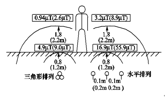 對于三相地下電纜輸配電線路,在其敷設(shè)位置上方地面所產(chǎn)生的磁場水平,取決于電纜埋設(shè)深度、3條相線之間的距離、導線的相對排列方式以及電纜中的工作電流。將三相3根電纜的間距減小,由于不同相位的三相磁場互相抵消的作用,可明顯降低地面的磁場;采用3芯電纜或?qū)⑷鄦涡倦娎|布置成三角形也可有效降低地面磁場。圖3-6給出了工作電流為300A的中壓(10~20kV)電纜(圖中括號外數(shù)據(jù))和工作電流為600A的高壓(110kV)電纜(圖中帶括號數(shù)據(jù))在常規(guī)埋設(shè)深度下產(chǎn)生的地面工頻磁感應強度數(shù)值及分布示意圖。由圖3可見,在直接敷設(shè)地下電纜的地面上方路段,工頻磁感應強度可達到10μT數(shù)量級,其數(shù)值比相應架空線路產(chǎn)生的磁場更高,但其影響范圍相對較小。同樣的分析結(jié)論也可見于美國南加州愛迪生電力公司的設(shè)計導則中。