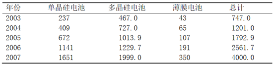 提高光電轉(zhuǎn)換效率和降低生產(chǎn)成本。太陽(yáng)能光伏電池通常用晶體硅或薄膜材料制造,前者由切割、鑄錠或者鍛造的方法獲得,后者是一層薄膜附著在低價(jià)的襯背上。晶體硅仍是當(dāng)前太陽(yáng)能光伏電池的主流。晶體硅電池包括單晶硅太陽(yáng)電池和多晶硅太陽(yáng)電池。單晶硅電池的實(shí)驗(yàn)室*高轉(zhuǎn)換效率可達(dá)24.7%,商業(yè)化電池效率為16%~20%。多晶硅太陽(yáng)能電池的實(shí)驗(yàn)室*高效率也超過了20%,商業(yè)化電池效率為15%~18%。除效率外,電池的厚度也很重要。降低硅片厚度是減少硅材料消耗、降低晶硅太陽(yáng)電池成本的有效技術(shù)措施。硅片的平均厚度已從2003年的0.23mm減小到2007年的0.18mm。下表為2003—2007年各類太陽(yáng)能產(chǎn)量MW