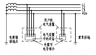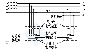 b) TN-C系統(tǒng):整個(gè)系統(tǒng)的中性導(dǎo)體和保護(hù)導(dǎo)體是合一的(見圖1-2)。