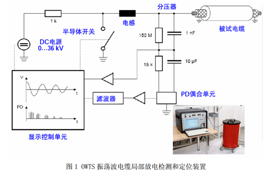 電力電纜由于其電容量大,很難在現(xiàn)場進行工頻電壓下的局部放電檢測。過去充油電纜采用直流試驗,可以大大降低電源的要求。但對XLPE電力電纜,由于其絕緣電阻較高,且交流和直流下電壓分布差別較大,直流耐壓試驗后,在XLPE電纜中,特別是電纜缺陷處會殘留大量空間電荷,電纜投運后,這些空間電荷常造成電纜的絕緣擊穿事故。采用超低頻(0.1Hz)電源進行試驗,要求試驗時間長,電纜絕緣損傷較大,可引發(fā)電纜中新的缺陷。振蕩波電壓是近年來國內(nèi)外研究較多的一種用于XLPE電力電纜局部放電檢測和定位的電源。該電源與交流電源等效性好,作用時間短、操作方便、易于攜帶,可有效檢測XLPE電力電纜中的各種缺陷,且試驗不會對電纜造成傷害。OWTS振蕩波電纜局部放電檢測和定位裝置如圖1所示。檢測時可以靈活施加0-28kV的直流電壓,合上半導(dǎo)體開關(guān)后,被試電纜與電感產(chǎn)生阻尼振蕩。該裝置可以檢測的電力電纜電容范圍為0.05uF-2uF。