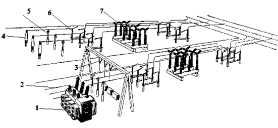 圖1 1—變壓器;2—導(dǎo)線;3—絕緣子;4—互感器;5—避雷器;6—隔離開關(guān);7—斷路器