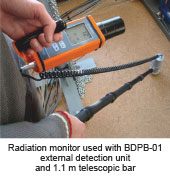 白俄羅斯ATOMTEX AT1125B 為一款輻射檢測儀,用于測量γ輻射劑量及劑量率,外接探頭BDPB-01與主機連接后,還可測量β表面沾污及放射性核素的活度。該款輻射檢測儀能夠用于搜查放射源、檢測廢金屬等。儀器內(nèi)置 NaI(TI)閃爍體探測器,可快速*地對較小的輻射改變做出響應。 此外,儀器的校正功能(能量范圍 0.05...3MeV),使得儀器的劑量率測量更加*。BDPB-01 帶有 1.7m 延長桿, 使得測量非常方便。
